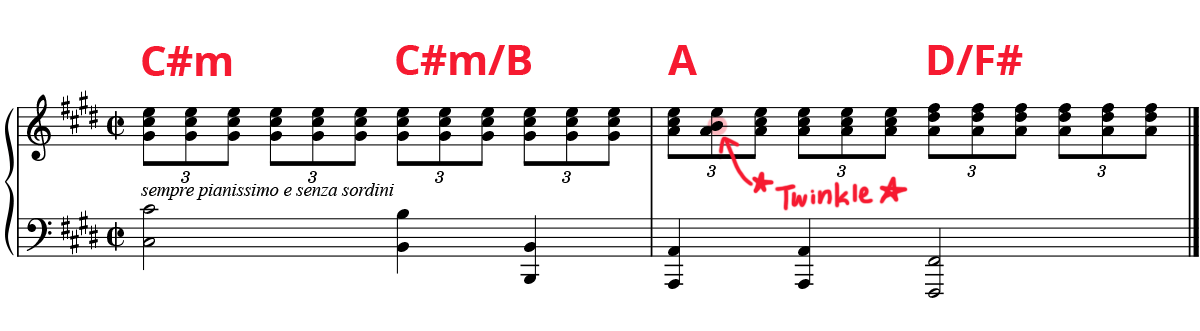 Instead of reading each and every single note in this intro (which makes me anxious!), I see the music in chords. I see that in the first measure, my right hand is playing C#m chord in 2nd inversion (G#-C#-E) and I’m playing the root note (C#) with my left hand.